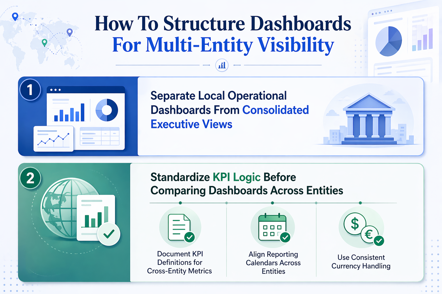 To make dashboards within a multi-entity environment more useful, teams need to separate local and consolidated views, standardize the logic behind shared metrics, and make sure comparisons reflect the same calendar and currency assumptions. This is one of the most important parts of aligning dashboards in a way that supports consistency across the organization without losing the detail people need to act.