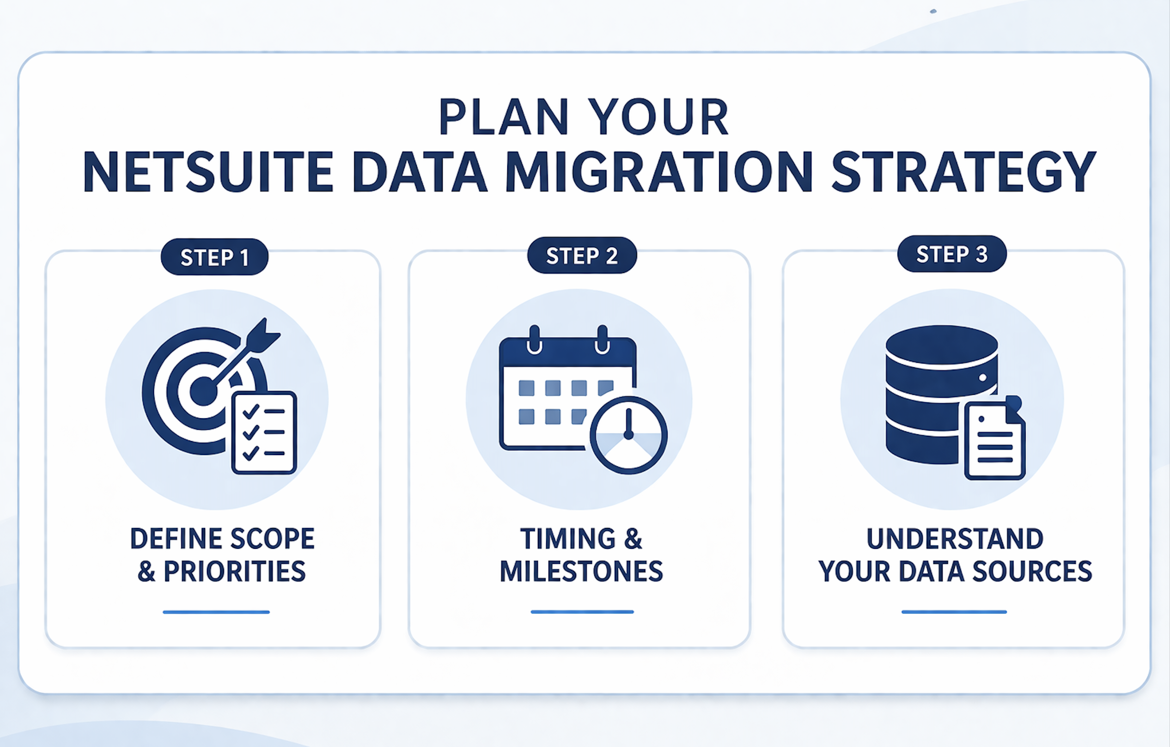 A structured migration plan creates clarity, reduces risks, and guarantees your project follows ERP data migration best practices. Effective planning defines the scope, sequencing, and responsibilities required to migrate to NetSuite successfully.